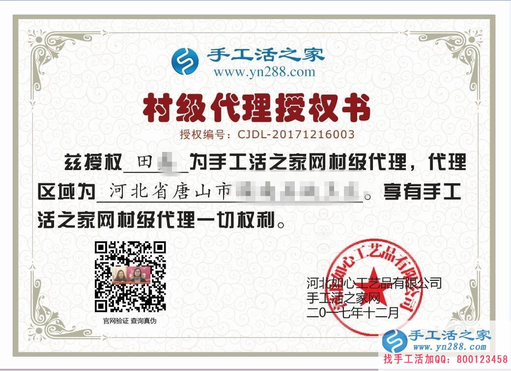 通過網(wǎng)絡(luò)查找,田女士看中了手工活之家網(wǎng)的外發(fā)串珠繡加工項目。因為田女士通過客服QQ:800123458了解到,這個手工活項目不但投資小風險低,而且技術(shù)簡單易學,不受文化學歷限制,男女老少都可以做;最重要的還是公司對代理商客戶有區(qū)域保護制度,一個地區(qū)只招一位代理商,沒有同行競爭,合作者可獨享利潤。