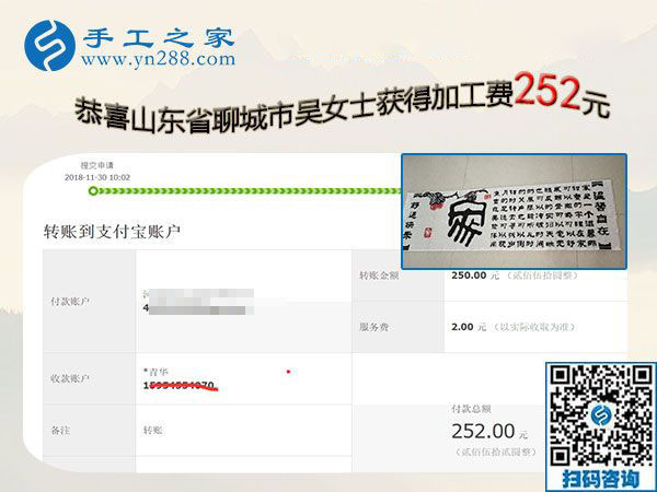 每隔一段時間,吳女士就會將自己的成品寄回手工之家,結(jié)算加工費,也簽收下一批的珠繡材料包。這一次,吳女士又寄回珠繡成品一幅,結(jié)算加工費252元。